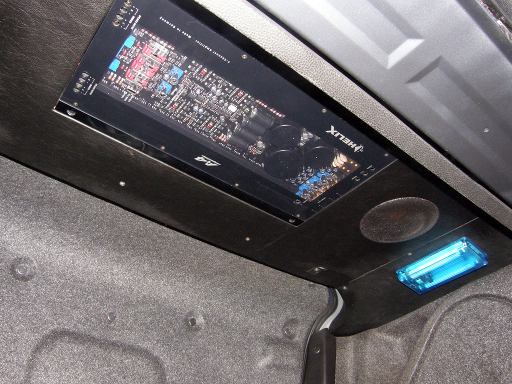 Вся инсталляция выполнена в варианте "сток", поэтому вроде как и ничего показывать, но может кому будет интересно. Компоненты: Усилитель Helix A4 Фронт - миды Helix RS806, твиттера Морель Супремо в корпусе от МТ3, кроссовера - самодельные последовательные первого порядка с частотой раздела примерно 2300 Гц. Саб Helix W10 в ЗЯ стелс в правом крыле багажника. Силовой 20 квадратов. Виброобезшумка всей машины, за исключением передних крыльев. Начну с саба. Усилитель установлен в верхней части багажника в специально изготовленный фальшпотолок: Естественно, стоит вентилятор для охлаждения (виден выход типа гриля на динамик). И собственно сам багажник: Миды в штатных местах в дверях на подиумах с доворотами и замененными грилями: Твитера в стойках на подиумах и обтянуты под цвет обшивки потолка: Это уже все типа ночью: Немного подсветки: Подсветка в ногах работает только когда открывашь дверь и до первого поворота ключом в замке, или 20 секунд: