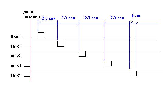Да, и вот еще, не знаю насколько это критично - импусьс по входу (от которого вся эта хрень должна закрутиться) может прити как на запущенную схему (уже после подачи питания), так и одновременно с подачей питания. надо наверное не по переднему фронту реагировать, а по заднему, или по уровню сигнала. И еще один момент - на выходах в момент инициализации пика не должен появляться низкий уровень. А то весь смысл этой байды теряется. При начальной инициализации (до определения вход\выход и уровня выхода) порты у пиков в каком виде живут? Куда "благодарность" засылать? ЗЫ - а нужна эта штука чтоб красиво обмануть блок стеклоподъемником мицубиси. И не столько обмануть, сколько закрывать окна поочередно. Выходы - это эмуляция родных кнопок стекл. |
