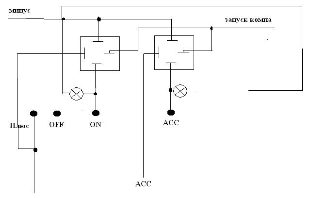 Я на схеме не изображал обмотки реле и т.д для упрощения, те кто понимают это обычные вазовские реле, опыт показал что для работоспособности данной схемы необходимо поставить еще и диоды в то место в котором сходиться управляющий согнал на запуск компа.