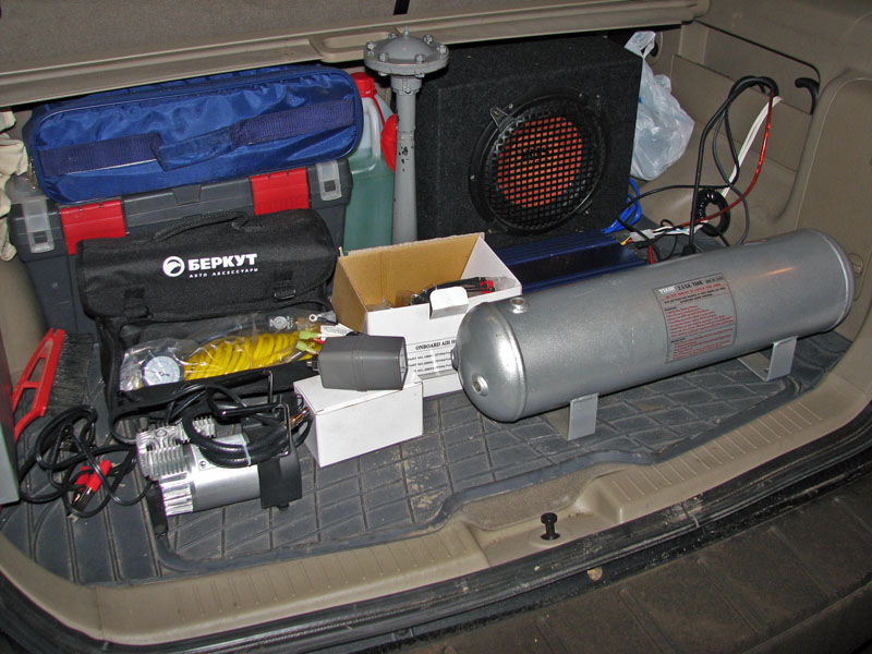 Дудку разместили в нише второй выхлопухи, рессивер удачно запрятали в багажнике под полом, там оказалась свободная ниша в техническом отсеке. Насос тоже разместили в салоне, в багажнике за дверцей была удачеая свободная ниша, там и повесили насос, закрепив через вибропрокладки, при работе не особо тарахтит.