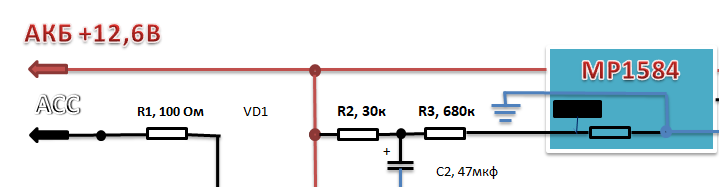 Как-то "криво" это... Если использовать резистивный делитель на напряжение запуска MP1584 выше 11.5В с конденсатором в нижнем плече для "поддержания" просадки во время кручении стартером, то кондёр работать не будет - при пропадании напряжения он моментально разрядится через резистор на "массу". Если ставить ещё и диод в эту цепь, то совсем "масло-масляное"... Хотя, как вариант для "безпроцессорного" управления может и сгодится...