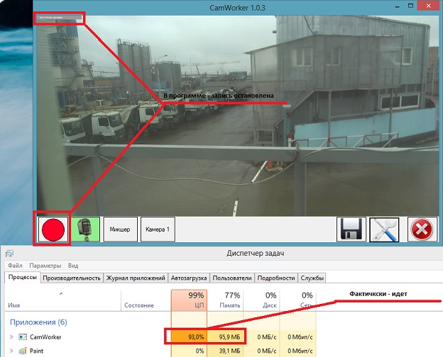 1. Выдает очень большую загрузку проца (см. вложения) 2. Запись фактически не идет (см. вложения) 3. Запись через программу не останавливается (см. вложения) Программу можно остановить только через Диспетчер задач (см. вложения) |