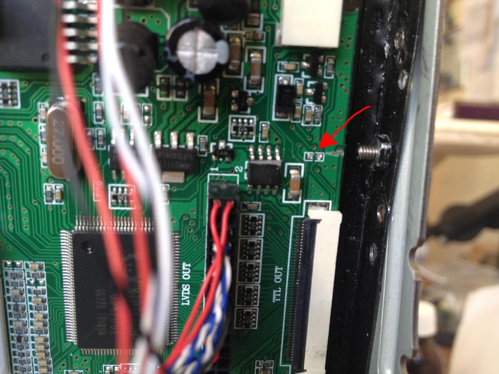 При установке контроллера снес сверлом SMD конденсатор.Помогите определить номинал. Находится с краю платы между TTL выходом и разъемом на внешнюю подсветку. Без него не корректно работает приемник IR - при подаче команды срывает синхронизацию.