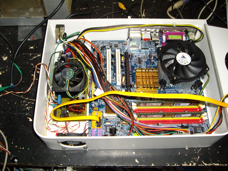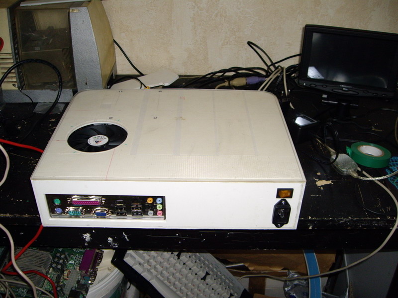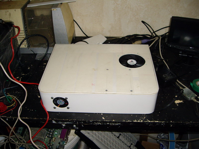 И так. Не везет, так не везет. Сначала на плате, которую планировал поставить Биостар M6VLR полетела сеть и USB. Сама плата рабочая. И что я не делал восстановить не удалось. Пришлось отключить чип в БИОСе, чтобы плата работала. Даже купил контроллер USB. На других платах работает на этой не хочет. Пришлось купить новую плату Gigabyte GA-965GM-S2 процессор P-4 935 3,2 память Kingston PC2-5300 - 512Mb x 2 . ну и HDD Seagate SATA-300 - 160 Gb. Пришлось съездить к Сергею, чтобы поменять задержку на БП, а то не запускалась плата. Сколько эта хрень кушает я не знаю, но провода 2,5 короткие греются, а акум правда (старый и дохлый) его хватает на короткое время. Начел делать корпус из пластика (пвха) и акрила (стекло). Вроде получилось не плохо и обдув корпуса хороший даже без доп. Вентилятора, хотя транс на БП становится очень горячим. Кстати я поменял на нем вентилятор поставил от пентюхи-3 он туда хорошо встал и обдув улучшился, и транс хорошо охлаждается. Размер корпуса получился 350 х 265 х 85 . Планировал его засунуть под сидение. Ну, тут опять не повезло он по ширене и высоте не лезет. По высоте надо убрать один сантиметр, а лучше больше. Теперь придется делать новый корпус из жести.