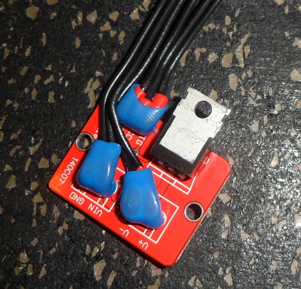 Чтобы сервомоторы не дергались в момент подачи питания, а такое встречается очень часто и мой случай не исключение, использовал готовый IRF520 MOSFET-модуль для Arduino. Немного его подправил для экономии места. Управление модулем через ШИМ. Плавное включение питания полностью решило проблему "дергания" сервоприводов. Обязательное условие- плавно включать нужно то питание, которое идет после DC-DC преобразователя. Мои сервы питаются 6,5 V.