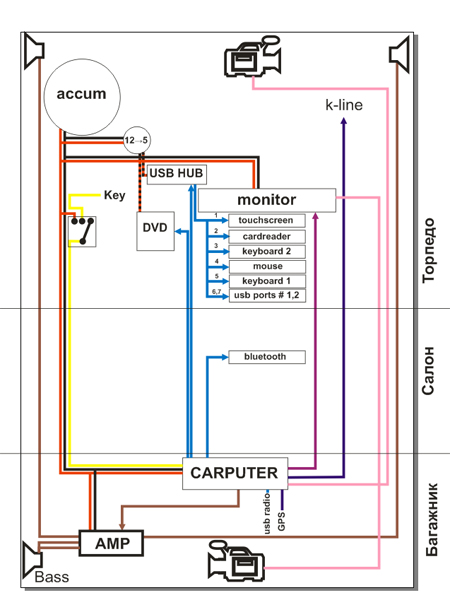 Панелька еще в "оформлении" - жду не дождусь. Как ни странно встала проблемка с покупкой 4 жильного провода для удлинения УСБ-магистрали багажник - торпедо. Хочется с экраном, и без разъемов (в смысле просто провод, а не шнурок - я сам отрежу скока надо ) - нигде не найду подходящего. Но буду искать. Интересно витая пара пойдет? А пока накидал себе схемку расположения элементов и их соединения для того что-бы не забыть проводочек пробложить.Легенда: красный +12 черный - земля желтый - АСС голубой - USB фиолетовый - VGA синий - COM розовый - коаксиал коричневый - акустика Зоны автомобиля показаны условно - блютус адаптер скорее всего поселится под задним сиденьем на стандартном USB удлинителе ввиду того, что места в хабе уже нет. 2 клавиатуры потому, что одна нормальная, а другая распотрошена на мультимедиа управлялку. Передние колонки - в дверях. Аккум под капотом ![]()