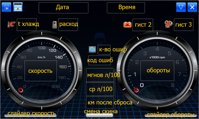 Взял за основу скин speed_2_1 и skin1 Venator отсюда http://compcar.ru/forum/showthread.php?t=4604, полученный результат на скриншотах. Поскольку в программировании полный "0", написать скрипты не смог (видно на фото). Что можно: - менять скин (есть специальная кнопочка) - на втором скине (на первом не смог сделать) перемещая указатель мыши по слайдерам (скорости или оборотов) видеть перемещение соответствующей стрелки. Больше ничего сделать не смог, "туп я в этом братцы". Вероятно не в соответствии с канонами вставил вид приборов первого скина, ну уж простите (о своих способностях писал выше). Возможно кто-то сможет довести до ума. |