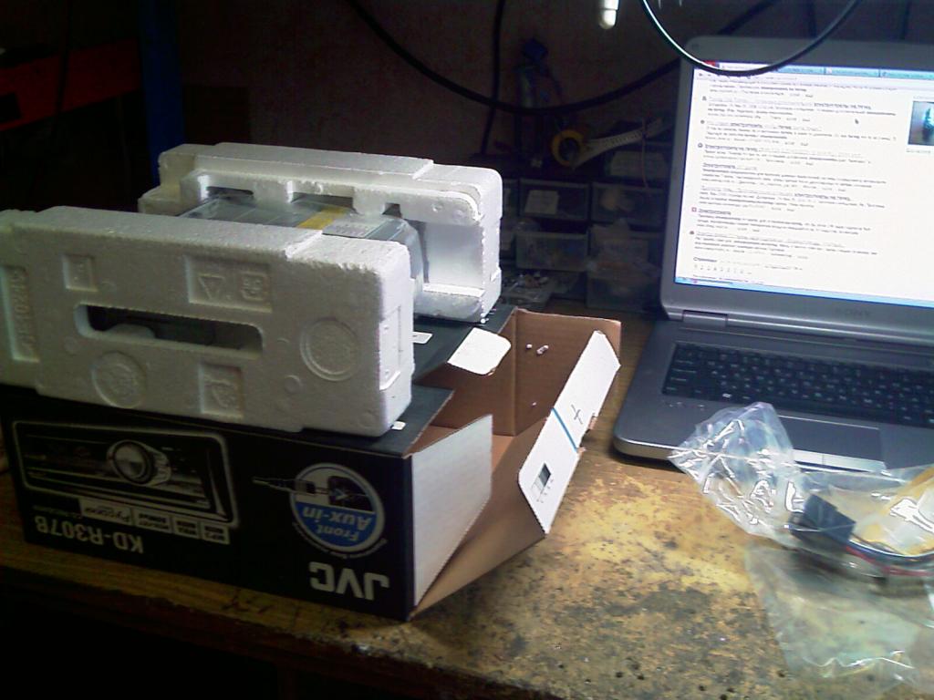 В качестве усилителя я успользовал магнитоллу JVC которую купил на той неделе чтобы разобрать.Вот такая она была. Магнитоллу в качестве усилителя выбрал исходя из соображении того, что не знаю как может повести себя комп.Хотелось радио так как бывают пробеги на короткие расстояния.
