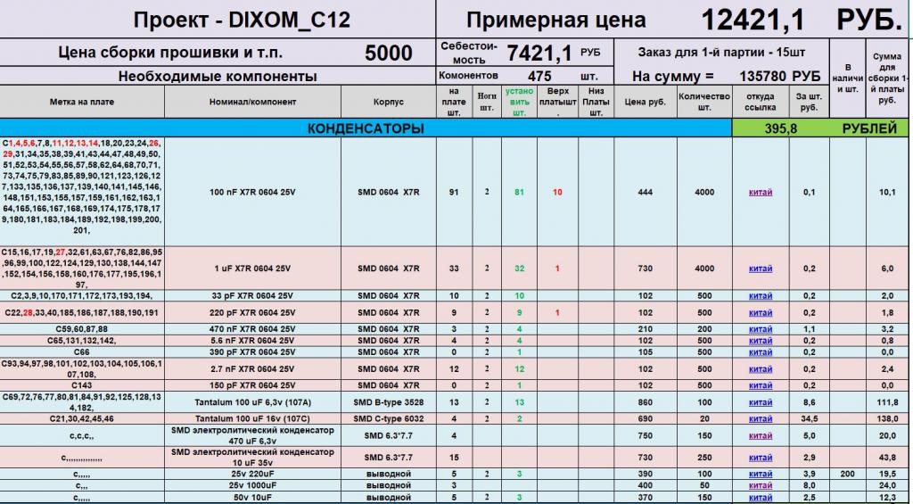 Замучился всё писать и считать на бумажках, всё забил в Excel так как количество комплектующих очень много, трудно уследить за всем). 2 дня ушло чтоб найти все необходимые комплектующие и составить таблицу. В общем то делюсь файлом, там сможете посмотреть откуда берётся цена на устройство, из каких компонентов состоит их количество цены и ссылки на комплектующие. Все подсчёты делаются автоматический. Количество комплектующих меняются в зависимости от количества запятых в поле "метка на плате" также и подсчёт цен и т.д. Общее количество компонентов на одной плате получилось 475 шт из них штук 100 приется паять в ручную. |