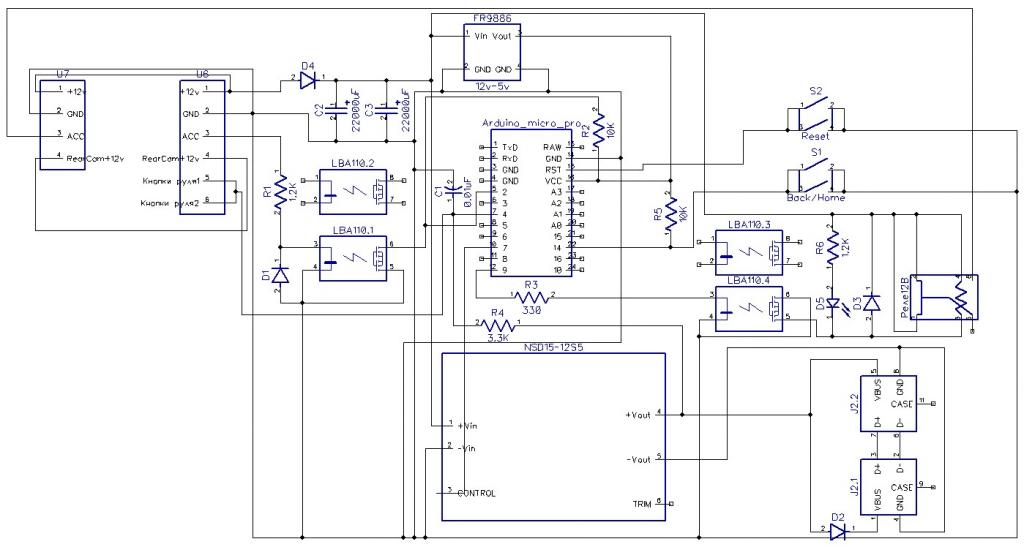 Взял за основу схему бп ув.Chubaka885, немного откорректировал под свои нужды. Немного не уверен в верности получившихся схем, поэтому прошу знающих людей проверить их, а так же помочь в редактировании скетча. Для обработки кнопок руля хотелось бы использовать скетч созданный ув. lti1