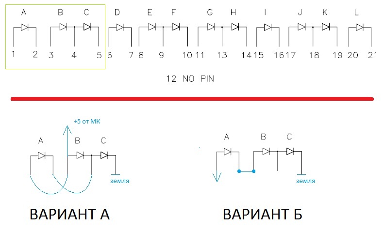 Там 12 светодиодов, но они собраны в странные группы (см рисунок). У меня на ардуине осталось 5 выходов. Дак и вот, мне надо с помощью 5 выходов зажигать на ленте по 3 светодиода на каждый выход. Было бы у меня 12 свободных выходов, я бы сделал на каждый вывод - одну лампочку. Но у меня 5 и я решил зажигать по 3 лампочки и за 5 шагов шкала дойдет до 100%. Лично я придумал 2 варианта, вариант Б МК не вытягивает, как я понимаю надо напр-е 7,5в. Это вести от 12 через плюс, а землю брать от МК. Вообщем вариант не очень. Вариант А работает, но светодиоды святят разной яркостью. ПРидется делать вариант с 7,5 в похоже. Может кто подскажет, возможно есть элементарный какой-то выход?