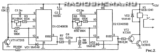 например: 10 минут работает, 1.5 часа отдыхает, снова 10 мин работает и тд. На просторах инета встртил устройства на AVR контроллере типа Атмега и микросхеме CD4060B Товарищи гуру подскажите по данной схеме! 1 - Получится ли установить такие задержки данной схемой. (таймер по достижении 8192го импульса на 3ей ноге появляется лог. единица, а задержка 1.5 часа; получается 1.5 Гц чтоли) 2 - В статье говорится о кондёрах в 2мФ с малым током утечки, это какие (тип) Исходная статья тут - http://www.radioshema.ru/elektronika...-11-16-48.html CD4060B datasheets не влазит по объёму (