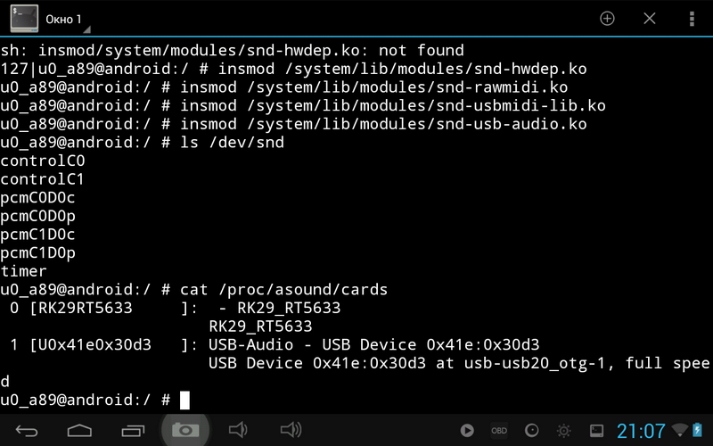 insmod /system/lib/modules/snd-hwdep.ko insmod /system/lib/modules/snd-rawmidi.ko insmod /system/lib/modules/snd-usbmidi-lib.ko insmod /system/lib/modules/snd-usb-audio.ko По идее, на стоке 4.2.1 (или СМ10.1) должно уже работать. Как у нексуса 7. Но поскольку у тебя 4.1, тут я не знаю как тебе (нам) помочь. Пробуй, авось повезет ) |
