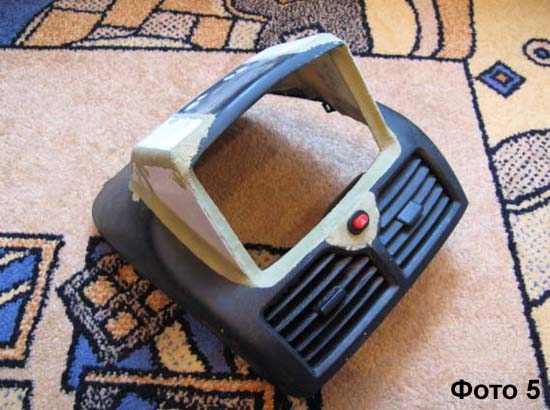 Для быстрого возврата к первоначальному состаянию была куплена дополнительная верхняя консоль. Разобрал торпеду, оказалось сами воздуховоды расположены ниже, чем я думал. Пришло решение опустить монитор ниже, срезав кнопки. К тому же, решил монитор не разбирать. К ниму прилагалась задняя рамка, ее то и решил крепить внутри. Фото 1: Решено - сделано (бормашина просто СУПЕР, давно хотел купить). Фото 2: Примерка на торпеде. Делал для подбора угла наклона монитора (для козырька были использованы вырезанные части от консоли). Фото 3: Создаем законченный профиль. Сначало вырезал шаблоны из бумаги, потом из 2 мм пластика, скреплял металлическими пластинами и болтиками. Фото 4: Бормашинкой внутри срезал лишнее от болтиков, оставил только по три скаждой стороны, может понадобится что-то прикрепить. Вид изнутри, что получилось. Переднюю стенку выпиливал из 1 мм пластика (брал 2 коробки от CD) . Фото 5: Далее обклеиваем эпоксидной смолой ЭДП (Россия) на основе обычного бинта в два слоя изнутри получившийся профиль. Тем самым заделываются щели в стыках. Перед этим все тщательно обезжириваем, использовал обезжириватель Welltex - он не разьедает пластик. Фото 6: Обмазываем снаружи двухкомпонентным пластилином Milliput все щели между частями профиля и формируем силует с боков и с переди. Пластилин отличный, темпиратура плавления после затвердивания 130 градусов (ушло 1,5 пачки). Вместо срезанной большой центральной кнопки аварийки встраиваем кнопку Prestige поменьше от скутера (кнопка съемная). Получилась очень жесткая конструкция. Теперь очень кропотливый этап - шкурение пластилина. Сначала вывел переднюю рамку, а затем с боков и все остальное. По пути решил сделать подиум для GPS. Фото 7: Потом все покрыл шпаклевкой для пластика и упорно шкурил опять до полного удовлетворения результатом (на заднем фоне подиум для GPS). Фото 8: Крепление монитора и проводов внутри консоли. Для крепления монитора использовал две штатные резьбы от часов (сверху) и из жести вырезал фигурную пластину (снизу). Для крепление проводов задействовал специально оставленные винты и хомуты из жести. Фото 9 (переделано): То что получилось после грунтовки и покраски. По-неопытности сначало нанес краску толстым слоем и получил подтек. Подождал сутки, пока краска полностью высохнет и очень мелкой шкуркой его зашлифовал. Покрасил снова и все ОК! На заднем фоне подиум с GPS GlobalSat BU-353. Фото 10: В связи с появлением программы регулировки яркости монитора (http://www.compcar.ru/forum/showthre...E8%F2%EE%F0%E0), переделал переднюю рамку монитора - скрыл кнопки управления. Для этого: двухкомпанентным пластилином Milliput вылепил новые очертания рамки и зашкурил, затем зашпаклевал, зашкурил, загрунтовал и покрасил всю консоль. Мне кажется, получилось менее "колхозно". Отверстие справа - доступ к свето-диоду монитора для ДУ-пульта. Цвет получился чуть-чуть светлее оригинального. Нанес 3 слоя грунтовки и около 6 слоев краски (краска СУПЕР). Есть мелкие огрехи незамеченные при шкурении, но практически не видны. Из опыта: шпаклевать надо ВСЕ! Фото 11: Используемые материалы. На переднем плане: финишная шпаклевка BODY BumperSoft, двухкомпонентный пластилин Milliput, бормашинка Proxxon IB/E и токовые клещи APPA-30R (использовались для сборки системного болока). На заднем плане: эпоксидная смола ЭДП (Россия), обезжириватель Welltex (не разъедает пластик), грунтовка Motip Plastic primer, 