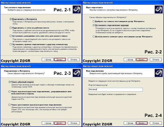 Купил этот модем с тарифным планом "Интернет старт", стоимость за 1 Мб (округление по 1 Кб в большую сторону) = 1,2 руб. Стоимость за 1 Мб за пределами Московского региона = 7 руб. Скорости приёма и передачи данных - 128 Кбит/с (круглосуточно). Подключение производил на основе инструкции от Z@GR http://forum.pccar.ru/showpost.php?p...&postcount=142, за что ему огромное СПАСИБО! 1. Скачал новые драйвера http://narod.ru/disk/23190142000/Win...0.00).zip.html. 2. Не подключая модем установил драйвера, запустив DriverSetup.exe (после запуска DriverSetup.exe визуально ничего не произойдёт, драйвера установятся в фоновом режиме, следует подождать несколько минут). 3. Подключил модем и отказался от инсталляции программы "MegaFon Internet". 4. Через программу My Huawei Terminal создал соединение с обнаруженным модемом, для этого (Рисунок 1): • выбирал "HUAWEI Mobile Connect - 3G PC UI Interface" и нажал "Connect". • в нижней строке прописал команду AT и нажал ENTER, в ответ модем написал "OK". • ввел команду: AT^U2DIAG=256 (режим модем + Card Reader, заводская установка) и нажал ENTER, в ответ модем написал "OK". • затем нажал Disconnect и передернул модем. 5. Создал новое Сетевое подключение: Подключить к интернет (Рисунок 2-1) -> Установить подключение вручную (Рисунок 2-2) -> Через обычный модем (Рисунок 2-3) -> Имя подключения: Мегафон (Рисунок 2-4) -> Номер телефона: *99# (Рисунок 3-1) -> Имя пользователя: gdata, пароль: gdata (Рисунок 3-2) -> Добавить ярлык подключения на Рабочий стол (Рисунок 3-3). 6. Зашел в свойства созданного соединения и на вкладке "Параметры" убрал все галки кроме первой (Рисунок 3-4). 7. Запустил ярлык с Рабочего стола и появилось подключение на скорости 236,8 Кбит/с. Для проверки балланса на счету использую https://www.serviceguide.megafonmoscow.ru/. Последний раз редактировалось Serg_w; 20.08.2010 в 19:09. |
