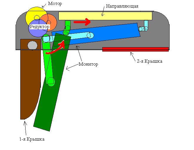 ![]() В принципе, конструкцию можно изготовить с использованием сервомашинок - одну, помощнее, на экран (типа http://www.pilotage-rc.ru/catalogue/75_/75_40/RC9317/); вторую, на крышку поменьше (типа http://www.pilotage-rc.ru/catalogue/75_/75_10/RC5746/). В чем преимущество - нет проблем с редуктором: он уже встроен в сервомашинку, примитивная схема управления. Для синхронизации работы машинок можно использовать микрики. |