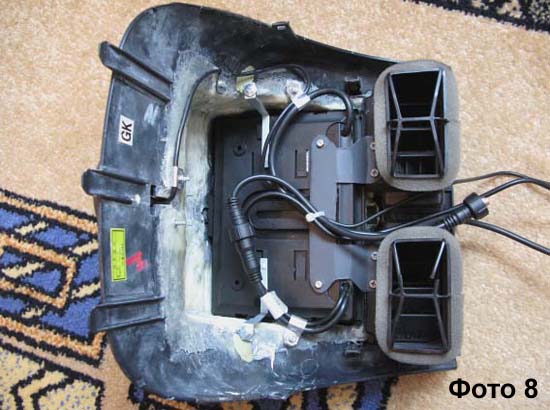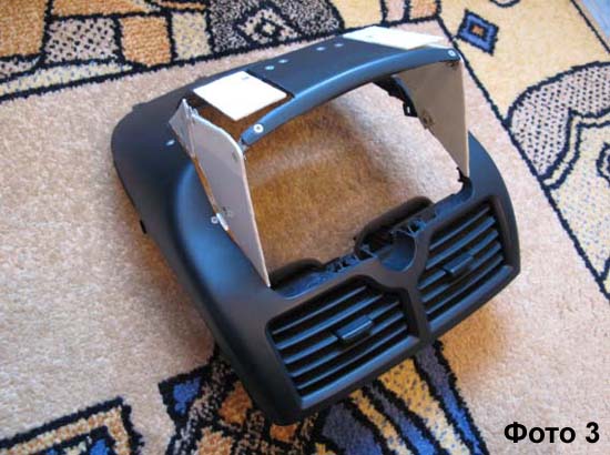 Для быстрого возврата к первоначальному состаянию была куплена дополнительная верхняя консоль. Разобрал торпеду, оказалось сами воздуховоды расположены ниже, чем я думал. Пришло решение опустить монитор ниже, срезав кнопки. К тому же, решил монитор не разбирать. К ниму прилагалась задняя рамка, ее то и решил крепить внутри. Фото 1: Решено - сделано (бормашина просто СУПЕР, давно хотел купить). Фото 2: Примерка на торпеде. Делал для подбора угла наклона монитора (для козырька были использованы вырезанные части от консоли). Фото 3: Создаем законченный профиль. Сначало вырезал шаблоны из бумаги, потом из 2 мм пластика, скреплял металлическими пластинами и болтиками. Фото 4: Бормашинкой внутри срезал лишнее от болтиков, оставил только по три скаждой стороны, может понадобится что-то прикрепить. Вид изнутри, что получилось. Переднюю стенку выпиливал из 1 мм пластика (брал 2 коробки от CD) . Фото 5: Далее обклеиваем эпоксидной смолой ЭДП (Россия) на основе обычного бинта в два слоя изнутри получившийся профиль. Тем самым заделываются щели в стыках. Перед этим все тщательно обезжириваем, использовал обезжириватель Welltex - он не разьедает пластик. Фото 6: Обмазываем снаружи двухкомпонентным пластилином Milliput все щели между частями профиля и формируем силует с боков и с переди. Пластилин отличный, темпиратура плавления после затвердивания 130 градусов (ушло 1,5 пачки). Вместо срезанной большой центральной кнопки аварийки встраиваем кнопку Prestige поменьше от скутера (кнопка съемная). Получилась очень жесткая конструкция. Теперь очень кропотливый этап - шкурение пластилина. Сначала вывел переднюю рамку, а затем с боков и все остальное. По пути решил сделать подиум для GPS. Фото 7: Потом все покрыл шпаклевкой для пластика и упорно шкурил опять до полного удовлетворения результатом (на заднем фоне подиум для GPS). Фото 8: Крепление монитора и проводов внутри консоли. Для крепления монитора использовал две штатные резьбы от часов (сверху) и из жести вырезал фигурную пластину (снизу). Для крепление проводов задействовал специально оставленные винты и хомуты из жести. Фото 9 (переделано): То что получилось после грунтовки и покраски. По-неопытности сначало нанес краску толстым слоем и получил подтек. Подождал сутки, пока краска полностью высохнет и очень мелкой шкуркой его зашлифовал. Покрасил снова и все ОК! На заднем фоне подиум с GPS GlobalSat BU-353. Фото 10: В связи с появлением программы регулировки яркости монитора (http://www.compcar.ru/forum/showthre...E8%F2%EE%F0%E0), переделал переднюю рамку монитора - скрыл кнопки управления. Для этого: двухкомпанентным пластилином Milliput вылепил новые очертания рамки и зашкурил, затем зашпаклевал, зашкурил, загрунтовал и покрасил всю консоль. Мне кажется, получилось менее "колхозно". Отверстие справа - доступ к свето-диоду монитора для ДУ-пульта. Цвет получился чуть-чуть светлее оригинального. Нанес 3 слоя грунтовки и около 6 слоев краски (краска СУПЕР). Есть мелкие огрехи незамеченные при шкурении, но практически не видны. Из опыта: шпаклевать надо ВСЕ! Фото 11: Используемые материалы. На переднем плане: финишная шпаклевка BODY BumperSoft, двухкомпонентный пластилин Milliput, бормашинка Proxxon IB/E и токовые клещи APPA-30R (использовались для сборки системного болока). На заднем плане: эпоксидная смола ЭДП (Россия), обезжириватель Welltex (не разъедает пластик), грунтовка Motip Plastic primer, 