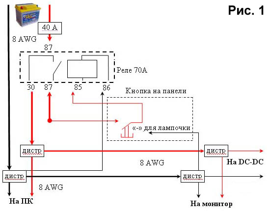 Рисунок 1: Электрическая схема подключения. ACC блока питания M2-ATX не задействован, вся систему включается кнопкой. Сделал так по двум причинам: • Если поездка на 10 минут по знакомому маршруту, то нет смысла включать PC. • Зимой возникают проблемы с промерзшим оборудованием. Лучше сначало прогреть салон, а потом включать PC. Фото 1: Моторный отсек. Протянул гофру с проводами 8 AWG, закрепил. Протягивал между крылом и корпусом, за педалями нашел отверстие закрытое резиновой прокладкой. Поставил колбу с предохранителем на 40 А (меньше не нашел). Концы проводов обжал клеммами КВ125-8-7. За неимением обжима, обжимал в тисках с помощью двух 3 мм сверел, использовал контактную проводящую пасту КВТ и в термоусадочные трубки. Фото 2: Силовая разводка. На основание закрепил реле 70 А с колодкой и два дистребъютера, все подключил по схеме на Рисунке 1. К клеммам колодки провода припаивал. Провода для дистребъютеров сначало покрывал оловом, а потом зажимал (получилось надежно). Основание и провода закрепил стяжками к жгутам штатной проводки. Нижний белый провод - это подключение вольтметра. Фото 3: Основание для РС. Из 3 мм пластика по размеру вырезал основание для РС с отверстиями для ножек корпуса. Снял переднее сидение водителя. Закрепил основание с помощью трех металлических пластин. Под основание подложил кусок плотного параллона. Провода: силовой для РС, USB от HUBа, витая пара с COM-разьемом от Блока управления, VGA от монитора, 3 мм джек от магнитолы. На все межблочные провода надо ставить ферритовые трубки, для снижения уровня помех излучаемых ПК. Трубки должны находиться как можно ближе к приемнику сигнала. Фото 4: Установленный корпус РС. Закреплен к основанию при помощи резинки от продуктовой тележки, расстояние до сидения около 1 см. Фото 5: Для контроля напряжения АКБ решил установить вольтметр (показания при работающем двигателе). Внизу слева в панели есть маленький ящичек для мелочей - использовал его. Из кровельного оцинкованого железа вырезал шаблон, вырубил отверстие. Покрасил черной краской и закрепил вольтметр. В ящичке, конструкцию закрепил сбоков двумя саморезами. Фото 6: Общий вид торпеды и пульт на руль Pioneer. В блоке управления в выведенные USB, вставлены клавиатура и мышь. Последний раз редактировалось Serg_w; 20.08.2010 в 19:10. |