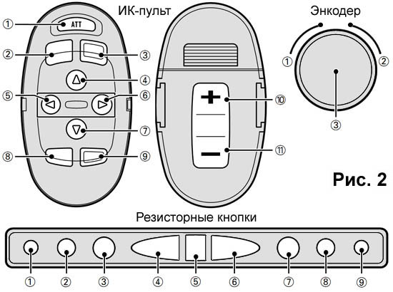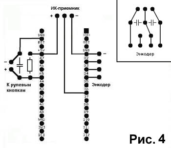 Был свободный 1DIN, поэтому пришла идея его задействовать. Фото 1 (переделано): Вид сверху. На нижнем уровне - инсталлирован DVD-RW. USB-кабель был разрезан и красный провод +5В был подключен через кнопку. Теперь, чтобы не потреблять лишнего питания, DVD-RW можно вкл/выкл кнопкой. На верхнем уровне - установил HUB на 7 портов, его провода питания и USB подпаял снизу платы и вывел через отверстия в корпусе. Для него рядом поставил DC-DC на отдельном пластиковом основании и приподнял на ножках. Фото 2 (переделано): Вид спереди. Снизу - DVD-RW и его кнопка вкл/выкл. Сверху - ИК-приемник для пульта Pioneer, кнопка вкл/выкл всей системы, кнопка Power, свето-диоды Power led и Hdd led, два разъема USB. Еще есть место для чего-нибудь. Возникли проблемы с корректным питанием DVD-RW (не хватает питания от одного USB-разъема), поэтому принял решение переделать блок управления!!! Вытащил DVD-RW, будет жить в бордачке - используется крайне редко. Чтобы не было проблем с питанием DVD-RAM, его надо подключать с дополнительным питанием или запитывать с "материнской" платы кабелем USB->USB+USB. Фото 3: Заново установил HUB на 7 портов, а для экономии места, его провода питания и USB подпаял снизу платы и вывел через отверстия в корпусе. DC-DC для него установил прямо сверху на корпус HUBа, прорезав в нем отверстие (напряжение на выходе 5,18В - что очень ХОРОШО). У него тонкие выводы, поэтому разместил его на отдельном пластиковом основании, а для удобства подключения добавил клемники. Установил колодку на 4 контакта: два нижних контакта - для кнопка вкл/выкл всей системы и кинул провода на кнопку, два верхних контакта - для силового провода +12В/-12В (использовал клеммы КВ16-6-4) и кинул провода на DC-DC для HUBа и -12В для подсветки кнопки. Кнопку купил на 220В, поэтому пришлось переделать подсветку: лампочку запитал через резистор на 4,7 кОм (чтобы не очень ярко светила). Прикрепил два USB разъема для подключения внешних устройств, провода укоротил и завел на HUB (распиновка USB-кабелей на Рисунке 1). "Маму" com-порта закрепил сбоку и завел на нее провода с кнопки включения РС и свето-диодов Power led и Hdd led. • В com-порту задействованы 6 ножек: ножка 1 - Power sw + (синий) ножка 9 - Power sw - (бело-синий) ножка 2 - Power led + (зеленый) ножка 8 - Power led - (бело-зеленый) ножка 3 - Hdd led + (оранжевый) ножка 7 - Hdd led - (бело-оранжевый) Реализовал три проекта: • ИК-приемник (http://www.compcar.ru/forum/showthread.php?t=4959). Конденсатор (10 мкф) и резистор (100 ом) стоят у ИК-приемника. • Энкодер (http://www.compcar.ru/forum/showthread.php?t=5148). Для схемы энкодера сделал отдельную печатную плату (Рисунок 3) с разводкой и конденсаторами (0,1 мкф), в нее впаял и энкодер. • Резисторные кнопки (http://www.compcar.ru/forum/showthread.php?t=4640). Вырезал кнопки из мультимедийной клавиатуры Genius, вставил четыре направляющих болтика длинной 3 см, выпилил прижимную пластину для резинового основания кнопок, спаял плату на которой разместил "микрики" с наклеиными пластинками для увеличения их площади и резисторы: 12-24-35-46-62-74-90-108-129 Ом (Рисунок 4). Спаял плату для Arduino Nano - схема на Рисунке 3, печатная плата на Рисунке 4. Чтобы все это объединить, хотел использовать проект Arduino All-In-One (http://www.compcar.ru/forum/showthread.php?t=5307), но эта программа работает не корректно, начинает гасить яркость монитора, хотя в скетче даже нет управления яркостью. Поэтому использую программу IRKey для ИК-приемника (она управляет так же и энкодером, и резисторными кнопками). За подсказку СПАСИБО -=zds=-! Чтобы не было конфликтов с друг