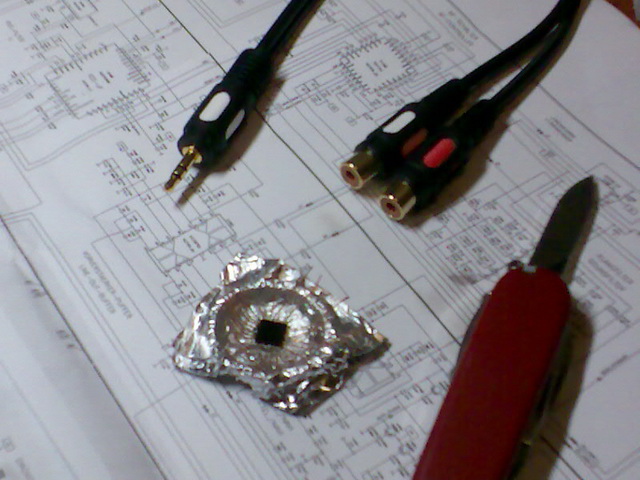 В магнитоле был врезан отсутствующий как класс AUX вход и добавлен чип для управления звуком по шине I2C. Чип распаян и залит эпоксидкой для последующего вживления в аппарат.