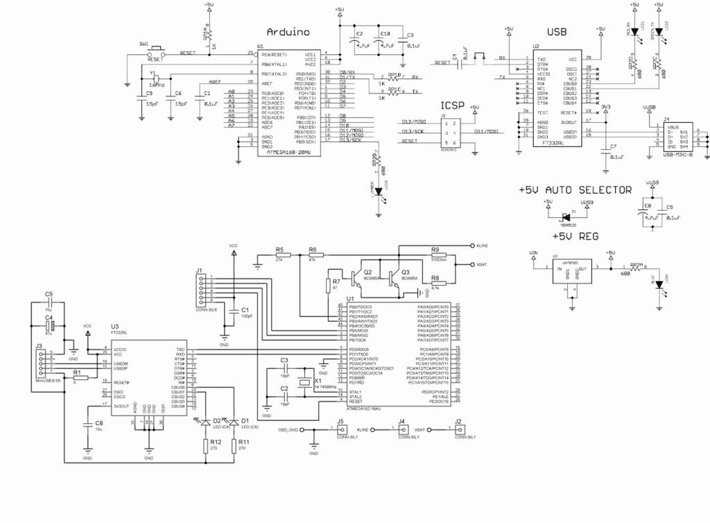 Я посмотрел на схему и схема почти такая же как и у arduino, только нужно кварц сменить и K-line драйвер добавить. Правда у arduino ценник на 300 руб дороже , но зато нет сложностей с разводкой и пайкой FTDI
