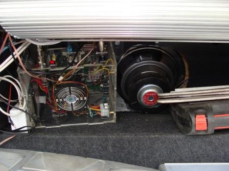 фанерных листов, по 20 мм каждая и вставлен за задним сиденьем ,проводку делал силиконовым кабелем 2,5 квадрата ,силовые кабеля отдельно плюс и минус по 35 кв каждный ,были брошены по лонжерону ,прихвачены стальными стяжками к топливным трубкам ,естественно каждый в своей стальной оболочке, для саба поставил кросовер с кетайской головой все это вроде как работало ,но чего-то не хватало |