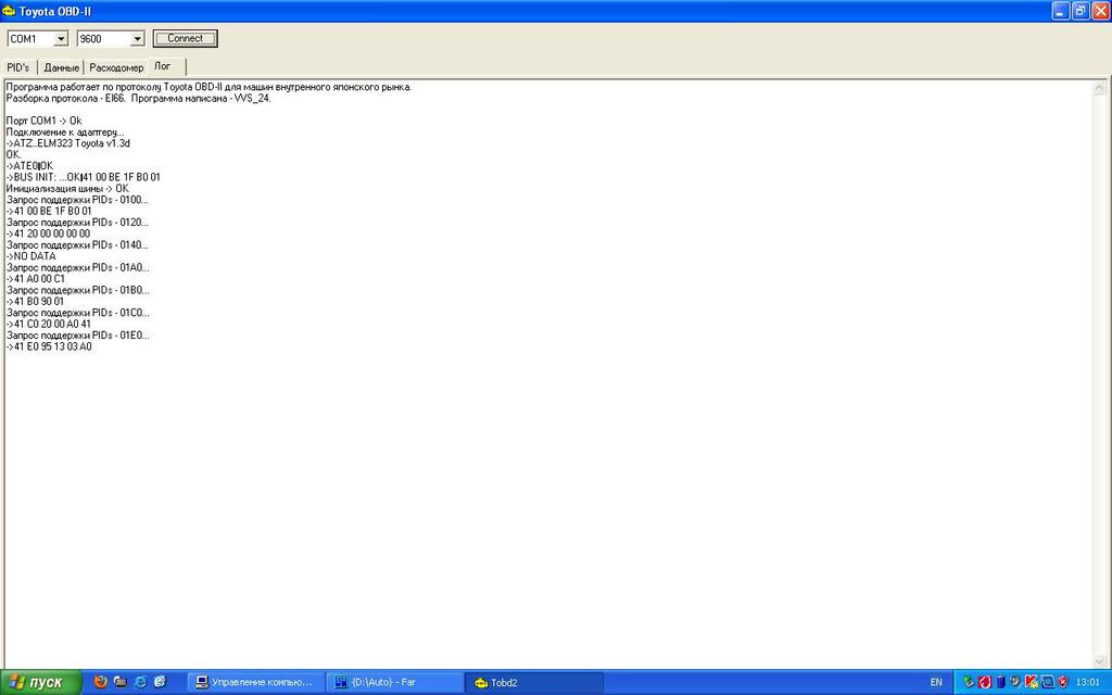 Закупил детальки для версии КОМ, прошил микруху с помощью набора BM9215 (кстати, для тех кто как и я делает это впервые, в моей программаторе неправильно указана перемычка использования внешнего питания). Помучился с подключением к ком разъему... и вуаля.. заработало.... есть некоторые данные.... но вот с tobd2 возник казус, зависает, на вложении видно последний пид, при этом светодиод Kline периодически помаргивает, а программа висит... активности на ком порту нету... P.S. Счас только что проверил сканер на другой машине, так вот после 1е0, двигатель глохнет, а сканлут подвисает адаптер, пока не выключишь обработку 6-го байта.. (версия прошивки 1.3d, версия tobd от 20.12) Это у меня адаптер кривой или руки? Последний раз редактировалось Krio; 10.02.2010 в 11:24. |