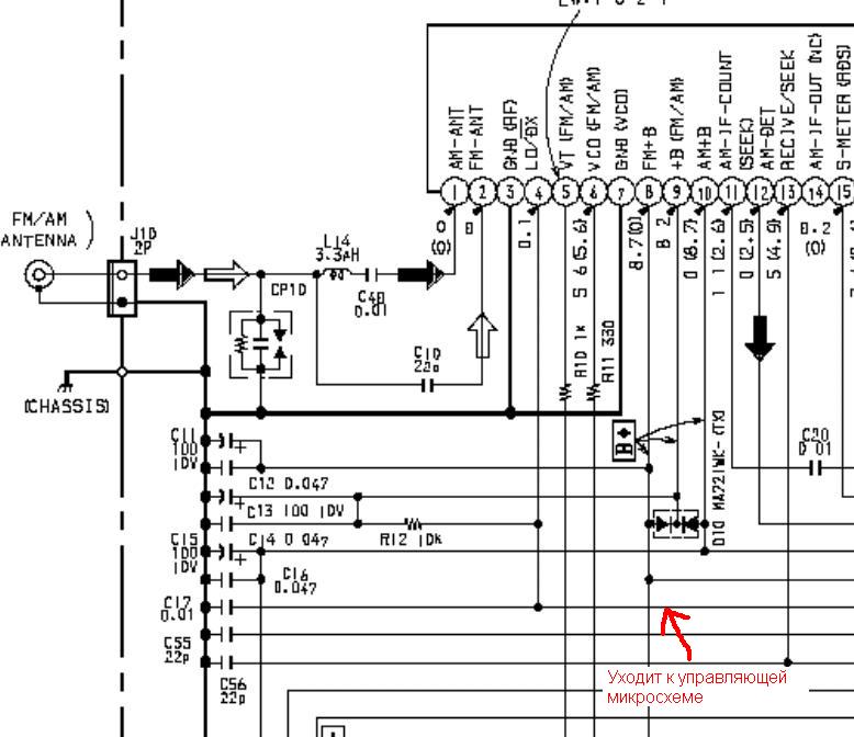 Сварганил тюнер. Всё работает, но прием очень слабый. Подозрения на ногу LO/DX тюнера Sony XR-C7220R. У меня она замкнута на землю. Не могу разобраться в схеме магнитолы: |