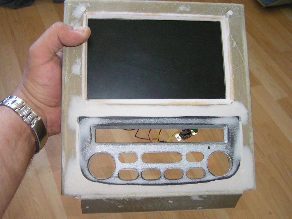 Панель решил изготовить новую. Дома был найден кусок винилпласта, загнуты края с помощью паяльника. Был вырезан климат из родной панели и с помощью шпаклевки со стекловолокном вмонтирован в новую. Для монитора изготовил корпус из того же текстолита, в нем же и переехал в новую панель. Пробовал красить, но так как никогда этим не занимался (несколько раз красил и шкурил, красил и шкурил