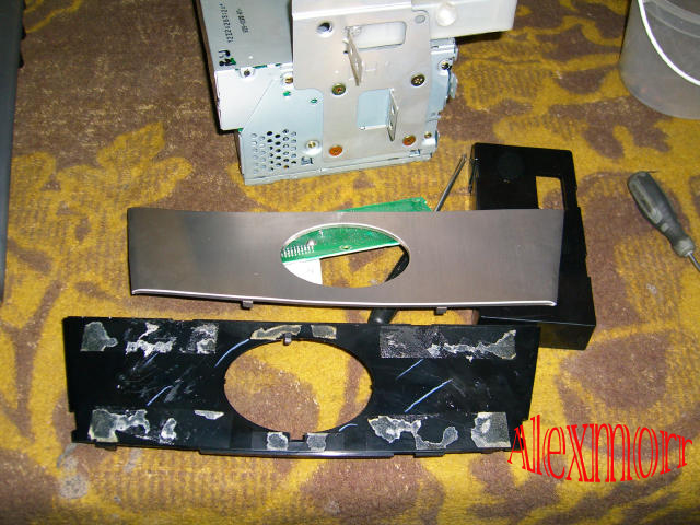 Порадовался что при установке не понадобилась эпоксидка.Материал из которого изготовлены воздуховоды называется ABS пластик.Были взяты ABS пластиковые полоски для ремонта бамперов и припаяны феном к воздуховодам для того чтобы монитор чётко,без зазоров встал на нужное место.Все места соприкосновения монитора и центральной панели были обезжирены и проложены двухсторонним скотчем 3М: Ну вот собственно сам монитор на его новом штаном месте: Корпус монитора оказался из того же ABS пластика.Стрелочками показаны места где напаяны перемычки между воздуховодами и моником.Красный и белый провод,это удлинитель для выпаенного ИК приёмника. Надёжность крепления была проверена физической силой...хрен оторвёшь ![]()