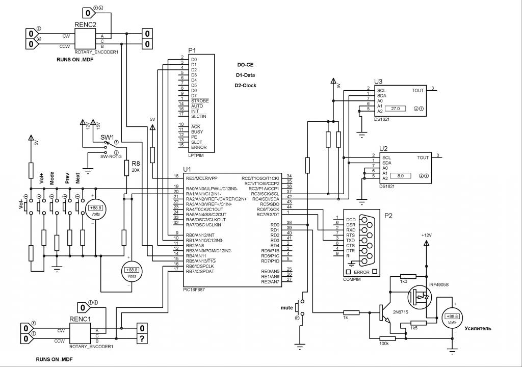 Назначение: 1-Обработка "рулевых" (резистивных) клавиш, различая короткое и долгое нажатие. 2- Обработки двух энкодеров громкость и переключение треков/радиостанций. 3- Считывание информации с 2х датчиков температуры (салонного и забортного) 4- Контроля напряжения бортовой сети ACC. Выключения PC через определенное время после пропадания АСС, задается через программу управления Блок питания подключен к сигналу АСС через трех позиционный переключатель (АСС ОFF +12В) и если я забуду его в положение +12В, чтобы PC Не разрежал аккумулятор до напряжения 11,5В порог отключения БП. 5- Включения усилителя после загрузки ОС. 6- Автоматической регулировки яркости монитора по сигналу от фоторезистора (пока не реализовано). 7- Управление радио тюнером от магнитолы (наработки Alex-L). во вложение модель для протеуса, исходники прошивки и тестовой программы для PC Последний раз редактировалось dadlick; 29.08.2010 в 21:44. |