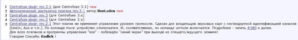 У меня следующие траблы: №1 и №2 (для СФ3) - не регулируется громкость; №3 (для СФ3) - СФ3 этот плагин почему-то не видит (может что не так делаю?); №4 (для СФ2) - не отключается радио, при переходе в режим прослушивания Media или просмотра Video; №5 (для СФ2) - не регулируется громкость. Тестирую на звуковой карте встроенной в Zotac 630. |