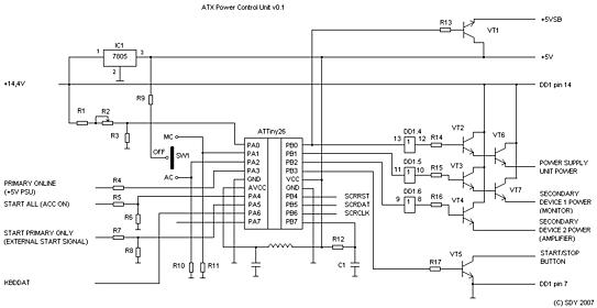 Для переделанного ATX БП http://www.pccar.ru/showthread.php?t=501 был сделан контроллер питания. Основа - мелкоконтроллер ATTiny26.