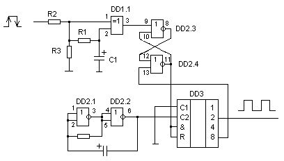 Кстати, для гарантированного формирования импульса по спаду можно добавить два резистора R2 и R3. Если R1 - 1K, то R2 - 2K, R3 - 1K (вроде бы так). Тогда вход - 12В. |