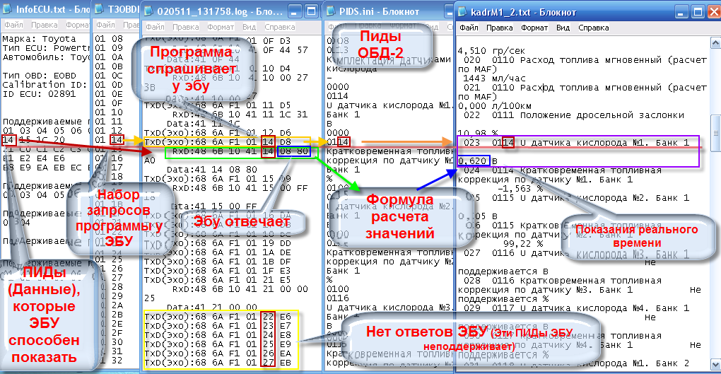 Теперь есть опять те же вопросы что и у всех кто начал юзать эту прогу.Для понимания ее работы (общее понимание) сопоставил разные файлы , ну и вкратце получил вот это Не знаю правильный или нет, был ход мыслей.Теперь те же самые вопросы Как удалить не поддерживаемые пиды (Активировать-деактивировать, скрыть-показать) - это не работает. Побывал удалять в PID.ini, ваще фигня получается, некоторые корректно удаляются, т.е строчки пропадают, а некоторые оставляют адресса, а есть вообще за собой тянут пол списка, хотя я удалял построчно и проверял по поддерживаемым пидам ЭБУ. Далее пытался в файле ЭБУ удалить запросы неподдерживаемых пидов -сразу получил горчишник Вернул все в зад. Еще, нашел пид D3. Решил зазвонить на него. В настройках, в адресс запр - ввел D3, это правильно? Вроде ответ пришел, но так как я еще туп в этом, то что дальше или нафиг он нужен? Или что с ним делать, лог прилагаю. |