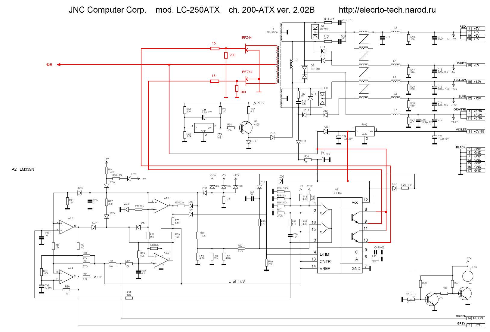 1) БП включается без нагрузки сразу при подаче на него 12 В, 2) при этом потребляемый ток 4,5 А, 3) IRFZ44 за несколько секунд нагреваются так, что до них невозможно дотронуться. Отсюда несколько вопросов к знатокам: 1) Я так понял, что у меня сгорела KA7500B, либо IRFZ44, либо и то и другое, заменить не проблема, в наличии имеются. Но в них ли дело? 2) Насколько критичны номиналы резисторов в данной схеме? 10 Ом вместо 15, и 180 Ом вместо 200? Как уменьшить нагрев полевиков? 3) по идеи в дежурном режиме включена только цепь на 7805 с фиолетовым проводом, а БП должен включаться при замыкании PS_ON (зеленый провод) на землю, как стандартный БП ATX или в этой переделке не так? |