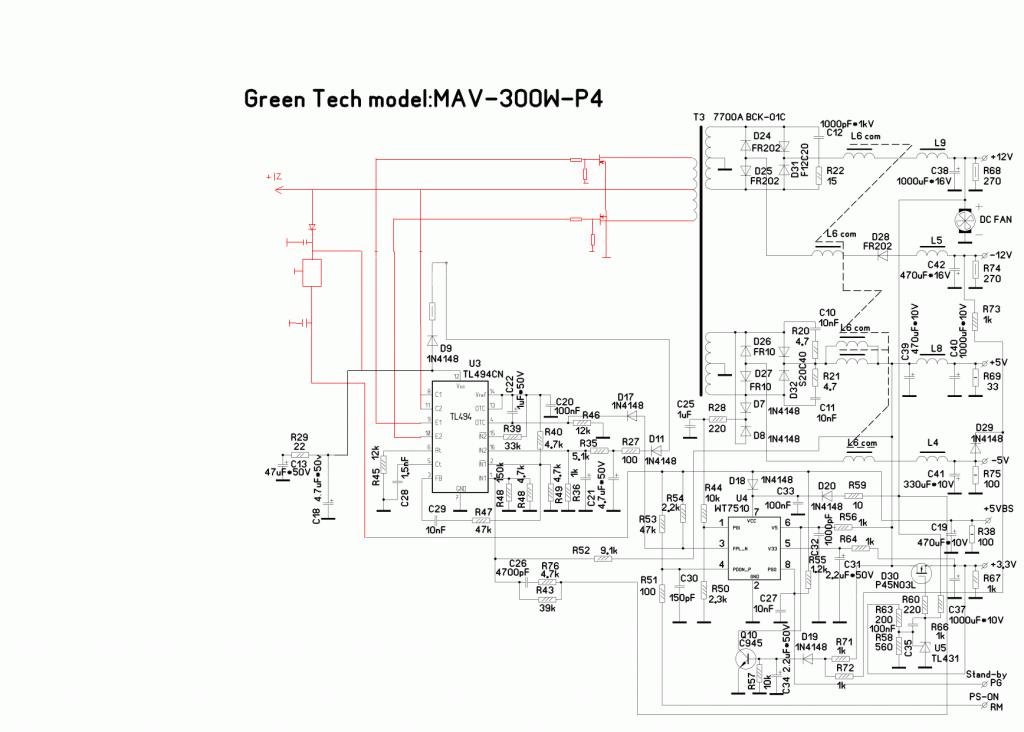 Перемотал трансфоматор, опять таже ситуация (вообще никакой реакции на PW ON - 0). Опять поиски схемы - нашел очень похожую, по схеме дежурка походу питает супервизор. Кинул с кренки +5 на то место где должен был быть фиолетовый. И о чудо появилось питание на PW ON и при замыкании его на землю вентиль закрутился. Радость не долгая, при подключении малейшей нагрузки срабатывает защита. Напруги примерно в норме, пока вентилятор работает греется конденсатор которой стоит на минус 12 (там показало минус 20 и на минус 5 - минус 10). Посмотрел по схеме перегрыз дорожку в сторону старой дежурки, оставил только в сторону сипервизора. Теперь не стартует, только вентилем дрыгает.