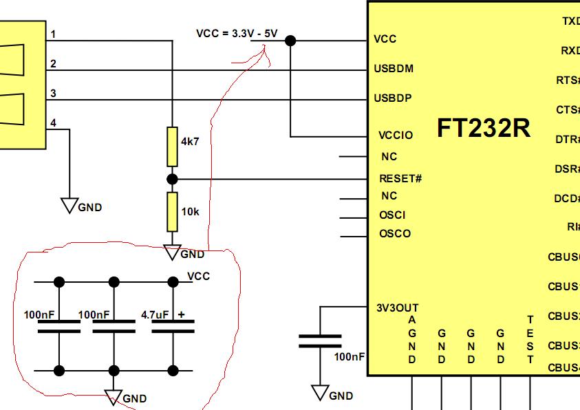 Есть определенные рекомендации на высокоскоростные цепи и резы с кондерами далеко не дурь...в даташите нету, но в модуле UM232 на том же сайти FTDI присутствуют, правда, только кондеры....в общем мое дело порекомендовать.