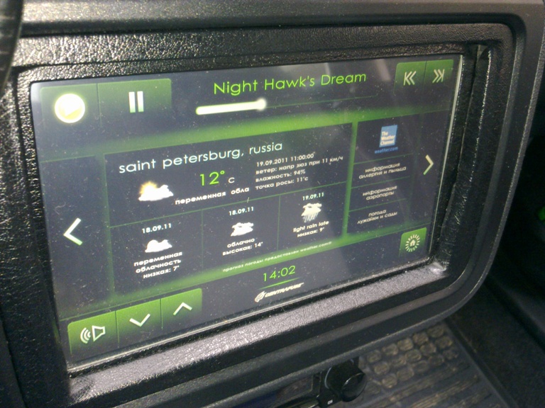 Далее по плану шла установка всего этого добра в машину. Инсталляция моника прошла без проблем. Встал как родной. Для устранения тех самых некрасивых отверстий была использована черная самоклеющаяся пленка, стилизованная под кожу, купленная в строительном магазине за 100р. Сам ноут прекрасно встал под бардачком. Я правда боялся, что его будут пинать пассажиры ))), однако за все те полгода что он там стоит - остался в целости и сохранности, более того, очень удобное расположение для снятия, установки доп. устройств и самого компа. Цвет интерфейса центрифуги я решил поменять под цвет приборной панели и подсветки кнопок на торпеде. На компе установлено: - MS Windows XP SP-3 (оригинальный образ MSDN, доработанный уже вручную) - Centrafuse 3.1. - IVT BlueSoleil 6 - iGO 8 (прога и карт на 1.5 Гб стянуто с очень известного трекера) Навигация сделана на базе USB GPS приемника DIGMA M-1. Данный применик был приобретен новым всего за 1200 р. Игоха! ![]() Погода. Интернет реализован благодаря 3G USB модему HUAWEI от известной красно-белой компании. Радио приемник реализован на тюнере USB Silabs FM radio. Кстати проблему плохого приема решил установкой мощной активной антенны с коэффициентом усиления 35 дБ и заключения самого тюнера в экран (металлическую коробку). Звук в машине от KENWOOD… :^) Жаль только что сам комп дает только стерео. Усилитель имеет 4 канала, либо 2+саб. А так оно смотриться ночью! ![]() Итог: Ноутбук ASUS X80L (Celeron M550 2.0 Ghz, оперативы 2 Гб, жесткий диск 120 Гб SATA) – 3000 р. Блок питания ноутбука ASUS Slim car charger – 1100 р. Блок питания для монитора – 300 р. Моник 8.9" BS SKD8.9VAS-9 – 5300 р. Усилитель – 2900 р. Комплект для подключения усилителя и четырех динамиков – 600 р. USB GPS приемник DIGMA M-1 – 1200 р. USB 3G модем – 800 р. USB Silabs FM Radio – 900 р. Саморезы, винты, стяжки и пр. мишура не в счет! ![]() Итого около: 16 000. Хотелось бы конечно дешевле, но... еще меньше имхо будет трудно! Последний раз редактировалось neoseven; 11.12.2011 в 18:49. |