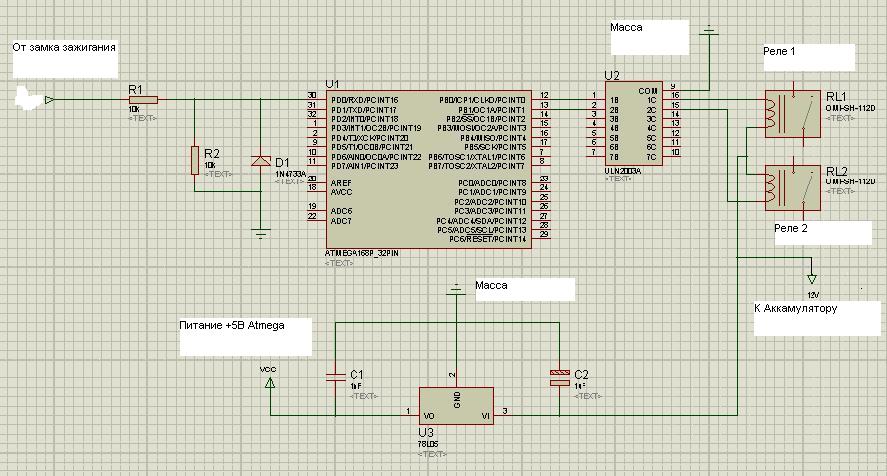 на сколько секунд ? нижняя часть схемы U3 нужна чтобы получить +5 вольт для питания микросхемы U1 . +5 вольт подаются на 18-ю ногу U1 ??? после выключения зажигания , после срабатывания релюхи , схема будет потреблять ток ? зарание извиняюсь , если вопросы слишком примитивные |