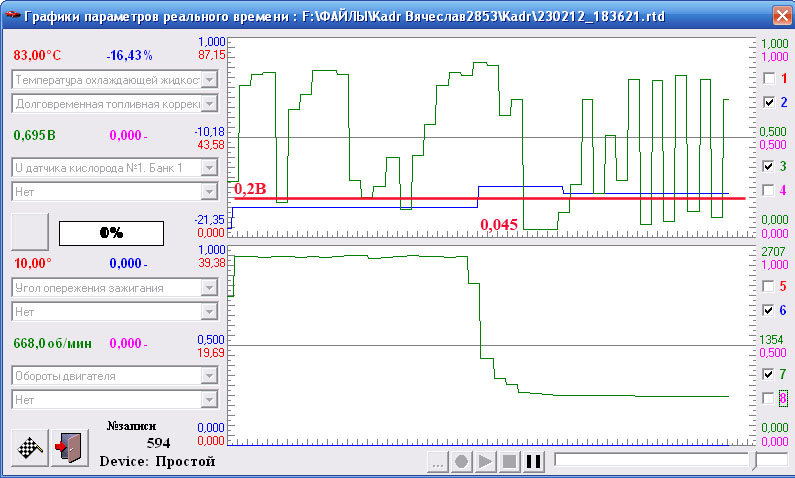 Красная линия 0,2 В - минимальный уровень сигнала постоянно должен опускаться ниже этого значения. На ХХ нормально, а вот на повышенных оборотах сигнал регулярно подолгу зависает выше. Обрати на это внимание - смесь обогащенная!.