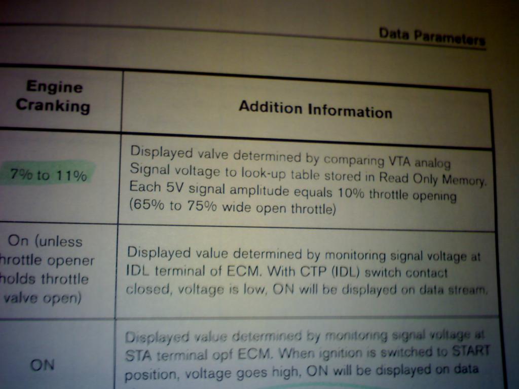 Примерно перевожу, что нашёл ещё: - Выходное напряжение с датчика положения заслонки пересчитывается, исходя из - 0V - 0%, 5V- 100%. Полностью закрыта: 8-20% Полностью открыта: 64-96%. - Вобщем смотрите, параметр "Состояние заслонки" - есть такой пид (не помню как точно, но смысл примерно такой (не могу сейчас посмотреть как правильно этот параметр называется)). При нажатии на педаль он меняется. |