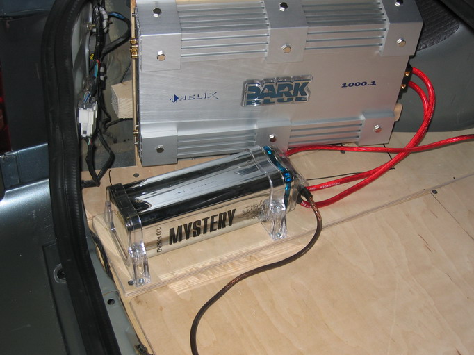 Итак...всвязи с тем, что желаемые колонки не влезли в боковые ниши, пришлось переделывать весь багажник. Были демантированы усилитель, компьютер и дополнительные аккумуляторы со всеми креплениями. Осталась прежней только несущая конструкция пола багажника. После чего нашлось место под сабвуфер (пришлось уменьшить люк для запасного колеса), было сделано крепление для усилителя для сабвуфера...демонтаж и монтаж занял около 12 часов работы Усилитель к сабвуферу...за ним расположены 2 дополнительных аккумулятора кондер подключен параллельно аккумуляторам... крепление сабвуфера, решили закрепить ремнями ипользую клипсы ремней для центрального пассажира внешний вид багажника на данный момент, как вы заметили, компьютера пока нет, он будет находиться за черным усилителем справа, в нише... плеер пришлось вынуть из машины, тк из-за баса анти-шок не справлялся ![]() ![]()