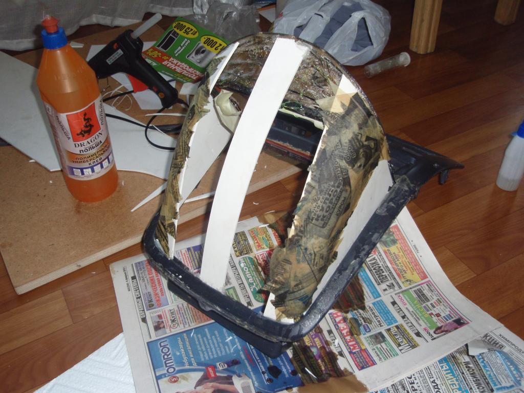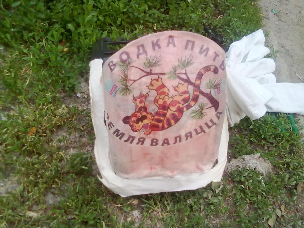 ПВХ в панельке клеил термопистолетом. После придания формы каркаса, посоветовался с батей, малеха изменил конструкцию. Взял старую потрепанную футболку, которую рука не поднялась выкинуть. Друг подарил давным-давно, чиста поржать. Но это все же лучше, чем выкинуть совсем