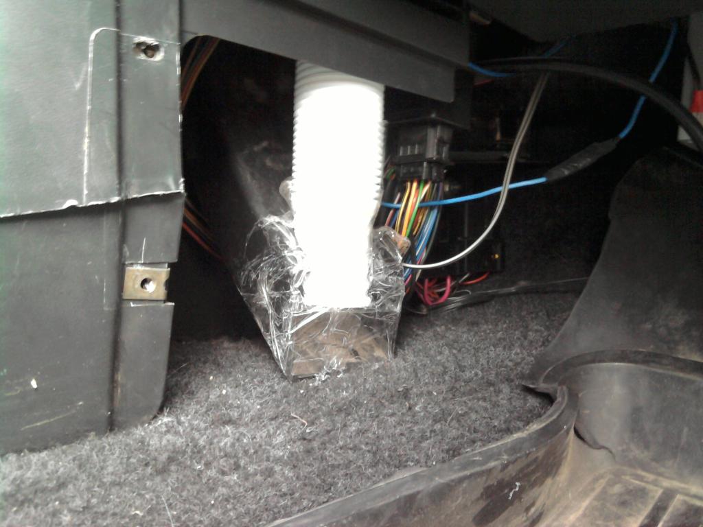 всё удовольствие обошлось в 5 рублей (гофра для раковины). воздуховод очень прилично влез в отвестие от лампы подсветки бардачка. которая ,кстати, всё равно там не нужна. а лампу скинул внутрь консоли, теперь внутри есть свет.....с ума бы не сойти..... |