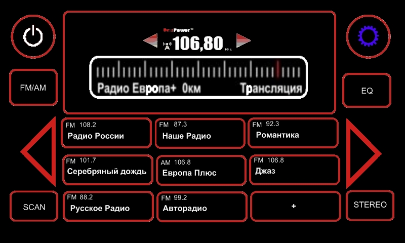 Кнопка "Выключить" не нужна, FM/AM, EQ, настройки самым нижним рядом. И все таки наверное 4 кнопки в ряд много, нужны еще стрелки по бокам для листания наборов кнопок и от бортика (края экрана) нужно расстояние побольше. А вот идея с частотой и диапазоном в кнопке на мой взгляд отличная. |