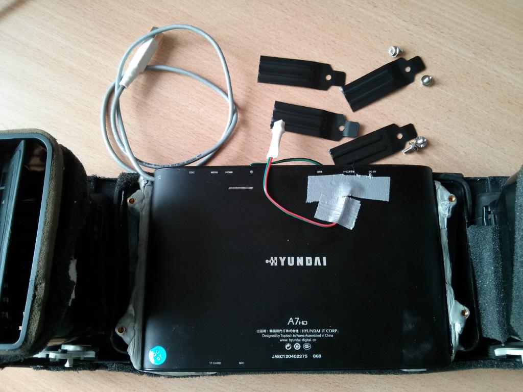 Комплектующие: -Планшет Hyundai A7HD => Yuandao N70 Dual Core => Google Nexus 7 (2012) Wi-Fi -Питание NSD15-12S5 (5V\3A) -USB HUB 7-port AirTone -USB DAC Creative SB X-Fi HD=> HifiMeDiy Sabre => HiFimeDIY Sabre U2 Asynchronous + HiFimeDIY USB Isolator -USB 3G-modem Huawei E353 => Huawei E3272 (4G)+ TP-Link TL-MR3020 -USB EasyCAP (STK1160) -Bluetooth OBDII EML327 -USB Flash 32Gb -Камера REAR VIEW SONY CCD -USB GPS Locosys LS23030 (MTК3329) => -не используется -USB Bluetooth "no name" => USB BT4.0 (CSR) => -не используется -USB Wi-Fi EDUP EP-MS1537 => -не используется ************ -фронт Morel TEMPO6 => Morel Elate 6.2(woofer)+MT22(tw)+MX22.2 -саб Focal Access 25 A1 -усь DLS MA-41 -ALPS (2X50K) ************ -Toyota Corolla E12 Hatch -Переходная рамка для 2DIN ************ Питание: Как все (надеюсь) знают, это довольно таки больной вопрос и касающийся буквально всех PCcar'щиков.... Для себя я сделал следующим образом...(как выяснилось, совершенству нет предела =) ) В качестве питания планшета и хаба со всей воткнутой в него периферией, использую DC-DC преобразователь MeanWell NSD15-12S5. На выходе 5в\3А, мощность 15W. Из главных плюсов, это гальваническая развязка земли, управляющая нога для включения и возможность корректировать выходное напряжение как в меньшую, так и в большую сторону(TRIM). Стабильная работа на протяжении уже нескольких лет. ************ Схема такова(начальная): -Модуль БП, запитан "хорошими" медными проводами 2.5кв мм напрямую от АКБ. -От АСС идет плюс как управляющий, который заряжает конденсатор на 10000мКф и включает релюшку, которая в свою очередь размыкает(рвет) землю на управляющую ногу NSD15-12S5, что дает включение модуля. То есть если эта нога замкнута на землю(когда нет АСС), то БП соответственно ВЫключен. Сам конденсатор нужен для того, что бы на время кручения стартером, когда АСС пропадает, релюха еще была под напряжением, т.е БП не вырубается и на хабе с планшетом питание не пропадает. Такой емкости конденсатора хватает на 7-10 секунд питания релюхи. Что мне очень даже дохрена, можно и поменьше... -АКБ планшета решено было пока оставить. Знаю что зимой умрет, есть опыт. Как правило его емкость потом становиться равна ближе к нулю. -Из планшета вывел провода для питая, подпаялся к гнезду зарядки. Можно было и использовать само гнездо, но у меня ограничение по высоте установки, а все разъемы как раз на верхней стороне планшета. -Из кнопок вывел только одну, кнопку питания. Что бы можно было и просто погасить подсветку, и включить\выключить, и аварийное выключение при удержании (если вдруг зависнет). -При появлении питания планшет сам просыпается(если был во сне).... на ночь его полностью выключаю. P.S.\\ На данный момент это еще далеко не завершенный вариант по питанию, возможно совсем уберу батарейку из планшета и запитаю напрямую от акб авто.... USB HOST: Это еще один больной вопрос для большинства КИТАЙСКИХ планшетов. Постараюсь объяснить почему. Дело в том, что они практически все не имеют полноценного USB-Host, а в место него выступает так называемый USB-OTG. Который с одной стороны, выполняет те же функции(подключение к нему различных юсб-уствойств), но имеет некие ограничения: -Максимальное количество одновременно подключенных устройств не должно превышать пяти штук. (Это в случае с процессором Allwinner А10, на других системах этого может не быть) -Некие ограничения по пропускной способности, из-за чего некоторые из устройств, либо отказываются работать совсем, либо начинают глючить и работать не совсем стабильно. Например: -внешняя звуковая карта в режиме 48,000 kHZ, а это все SB Creative, будет иногда заикаться и потрескивать. -USB EasyCAP не работает вообще. Выход из дан