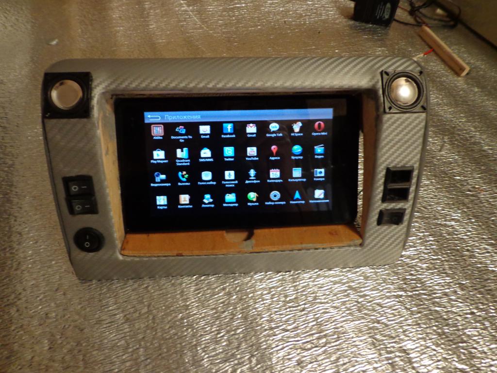 Сделал переходную площадку для нижней части консоли,чтобы разместить планшет как нужно. Осталось,вновь обтянуть карбоновой плёнкой,приделать кнопки,подключить питание к кнопкам,подключить динамики и расположить их в консоли,найти защитные решётки для динамиков.Покрыть всю внутреннюю часть консоли серым карпетом..и..установить в машину. Есть одно но..Данный проект считаю предэтапным..т.к. делаю консоль на будущее..В конце всё же размещу,что-то более существенное либо другой планшет со всеми выходами включая регистрацию и полноценный юсб-хост,либо carpc на базе старого ноутбука..