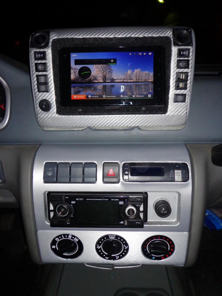 ![]() Убрал динамики,закрыл отверстия от воздуховодов центральных,путём увеличения толщины основания(низа) консоли. Выглядит так. Крепится модуль-консоль снизу на штатные крепления воздуховодов.И вместо ненавистного мне карбона обтянул плёнкой под шлифованный алюминий.Так же сбоку приделал декоративные решётки. Видом я остался доволен. Поездив немного и поразмыслив,всё же думаю что буду делать вместо снимающегося планшета-штатную установку.Возможно пока поезжу так,но сделаю на всякий случай все выходы+рамку. -Звук решил выводить через стандартный 3,5 джек+усилок от китайских динамиков и попробую вывести эту приблуду на штатную акустику -так же хочу спаять удлинитель microSD-SD,чтобы закружать фильмы,музыку,программы не через флешку, а через карту SD или микросд(с использованием адаптера)Таким образом решу проблему отсутствия нормального usb-host -Думаю над разработкой оригинального интерфейса(рабочего стола) -Ищу краску, чтобы покрасить кнопки в штатный тёмно-серый цвет.