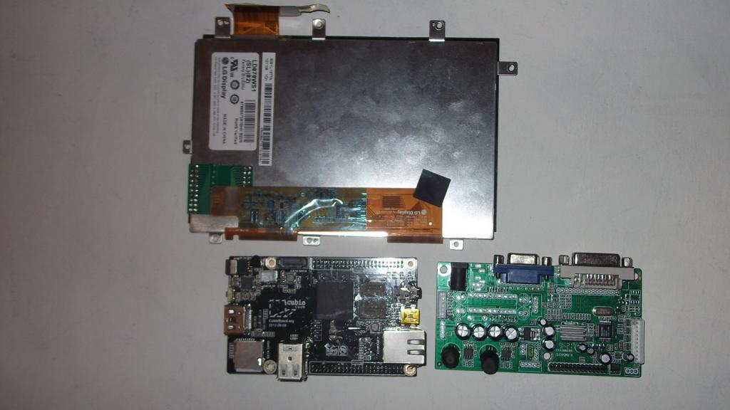 Можно так же укомплектовать матрицу миниатюрной мат. платой ,как на фотографии. 2.подпаивались к тому контроллеру что на шлейфе тача. 3.контроллер без переключения на кзв,но с дополнительным входом DVI и с пультом дист. управления(кому не нужно переключение на камеру,но необходим дополнительный разъем и наличие пульта- достаточно удобный вариант) 4 Вопрос решался поиском матриц-доноров с подходящими параметрами драйвера подсветки,теперь будет своя плата для этой матрицы. 5.Заказывайте. По поводу фото На фото матрица LD070WS1 с емкостным тачем.1024*600 Матрица интересна своими очень хорошими параметрами(IPS,соответственно -углы обзора,контраст на очень высоком уровне) И обратите внимание на выступающие черные области,с двух сторон - это и есть емкостной тач.С двух других сторон он даже меньше,чем сам корпус матрицы. И сердце комплекта - материнская плата Cubieboard http://cubieboard.org/ На ARM процессоре Allwinner A10 http://www.tabreview.ru/news/allwinner_a10 На фото я сравнил габаритные размеры этой отладочной платы,с самым маленьким из имеющихся на рынке ЖК контроллером,даже китаец имеет немного большие габариты. В общем спрашивайте,обсудим перспективность подобного варианта. |